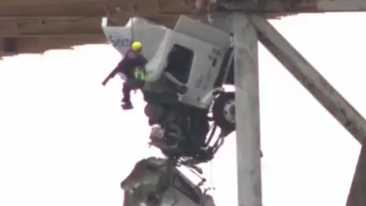 El vehículo no cayó por completo porque se trataba de un camión articulado. Cuando la mujer perdió el control de la cabina tras el choque, esta fue la parte que sobresalió por el borde del puente, mientras que el resto del cuerpo del vehículo quedó en la plataforma, haciendo de contrapeso. Quedó colgada a unos 23 metros por encima del agua, según informa la BBC.