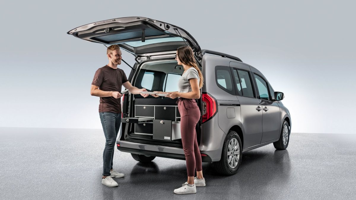 La primera tiene un formato de cajones que cerrados forman un bloque que aprovecha el espacio de carga, pero que la abrirse muestran una dotación bastante completa que incluye una nevera de 31 litros, un fregadero conectado a un sistema de agua con un depósito de 13 litros, un fogón a gas, cajones para cubiertos, vasos, platos, etc. Para acceder a ellos y utilizarlos hay que abrir el portón trasero, lo que puede no ser muy práctico en días de lluvia, y en conjunto el módulo pesa 60 kilos.