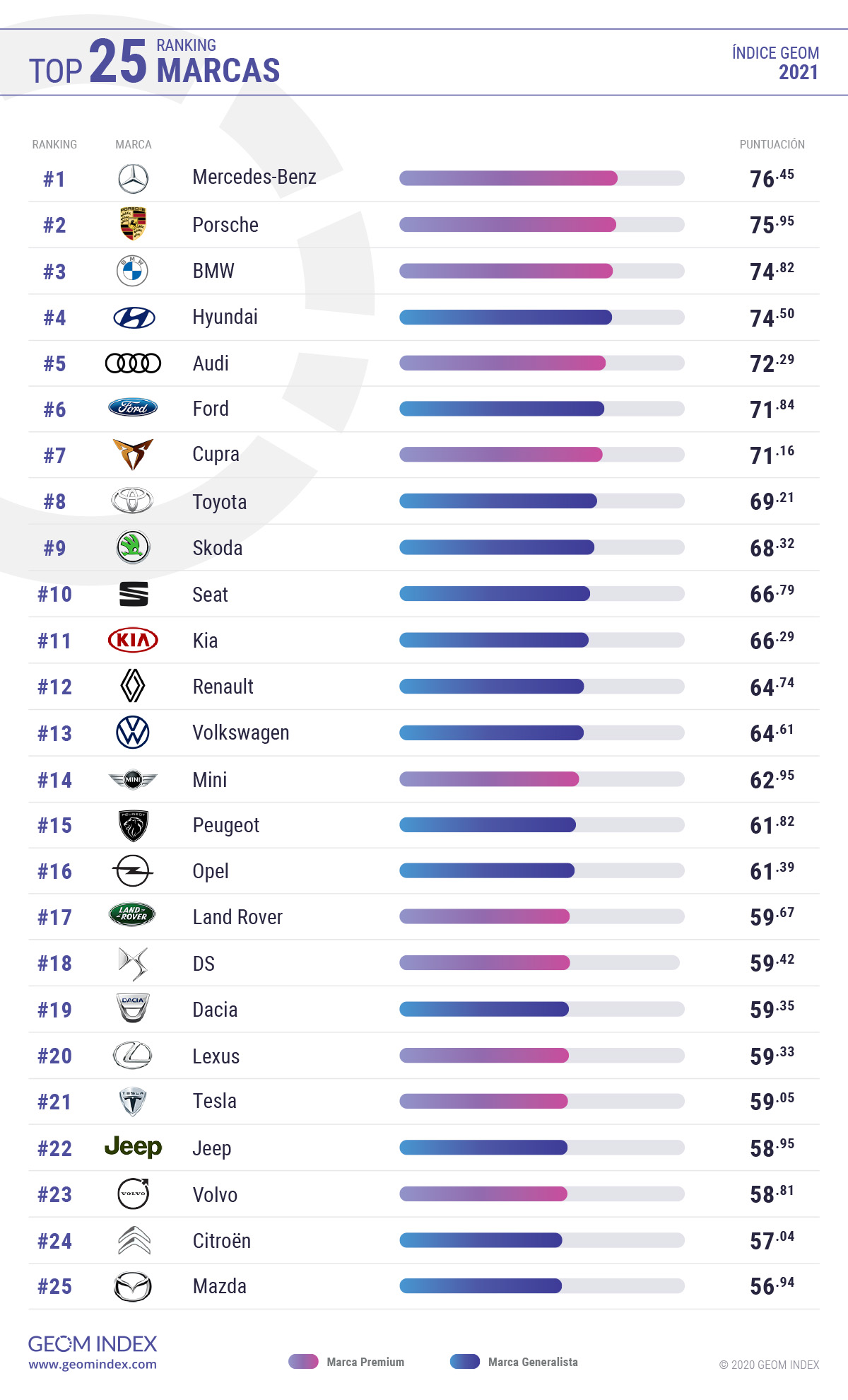 Según datos facilitados por GEOM Index, para elaborar su clasificación la compañía ha analizado casi dos millones de textos publicados en 2021. Mercedes-Benz ha logrado la valoración más alta con 76,45 puntos, después de que se hayan ponderado las opiniones positivas de los internautas y la capacidad de la marca alemana para genera menciones en la red.