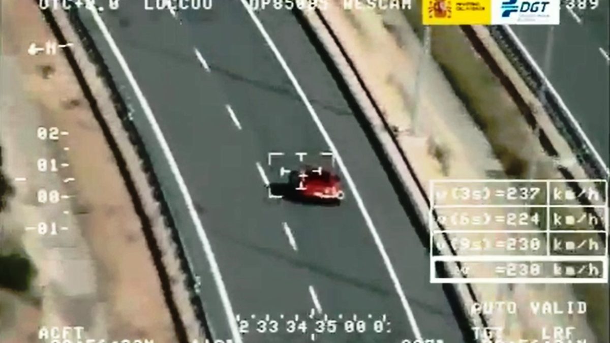 Uno de los helicópteros de la Dirección General de Tráfico (DGT) ha registrado la mayor infracción de velocidad captada por este medio: un automóvil circulando a 242 km/h por la A40 a su paso por el término municipal de Ocaña (Toledo). El hecho de produjo el pasado día 25 de este mes a las 17:51 horas y el conductor de un Porsche 911 GT3 RS, con matrícula estadounidense, fue detenido por la Guardia Civil, tras recibir el alto desde el helicóptero, y puesto a disposición judicial por un delito contra la seguridad vial. Se enfrenta a una multa de 600 euros, además de entre tres y seis meses de prisión en función de sus antecedentes.