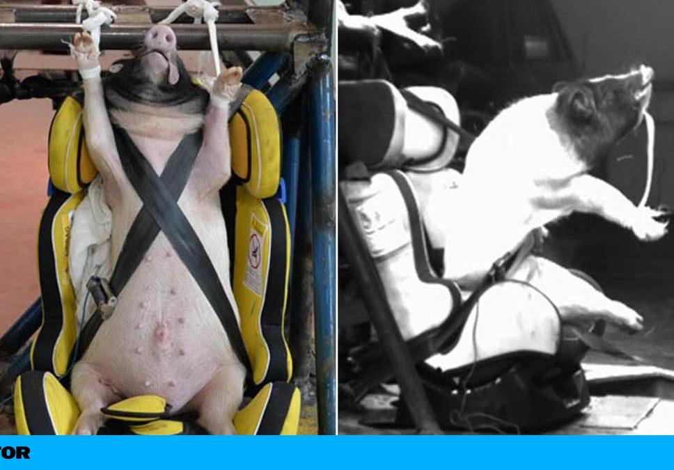 Las imágenes son impactantes y también la explicación que las acompaña. Un grupo de científicos chinos utilizó cerdos vivos en lugar de maniquíes en varias pruebas de choque para investigar las consecuencias de un accidente en su cuerpo. El resultado fue la muerte de siete animales jóvenes después de soportar impactos contra la pared a unos 50 kilómetros por hora.