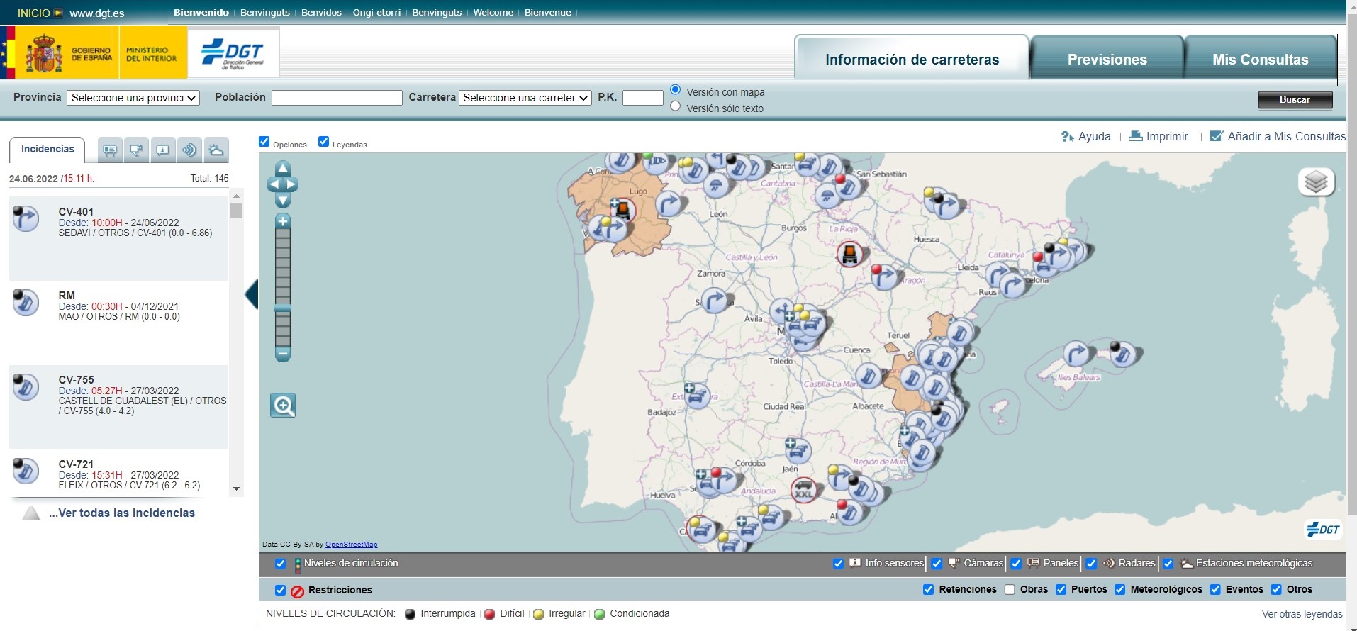 En un mapa de España ampliable de forma táctil o por una escala móvil, se aprecian todas estas incidencias identificadas. Se pueden seleccionar las que el usuario considere más interesantes o todas ellas: restricciones al tráfico, retenciones, obras, avisos meteorológicos, eventos…
