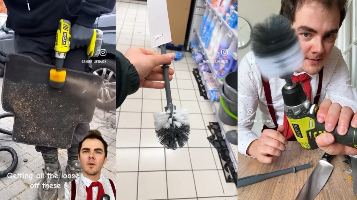 Como se ve en la publicación de Instagram, hay que cortar el mango de la escobilla para poder adaptarla al taladro, siempre con cuidado de no dañar esta herramienta. Una vez insertada la escobilla del retrete en el taladro, basta con pasar este cepillo por las alfombrillas.