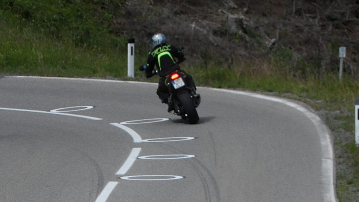 Su función es la de dibujar la trazada idónea para conducir por la curva evitando caídas. Eso sí, para que funcionen de manera eficaz, el motorista tiene que entrar en el giro a la velocidad adecuada. Según la KFV, uno de los principales accidentes de motoristas en carretera es la caída de la moto con salida de la carretera hacia la derecha en una curva a la izquierda.