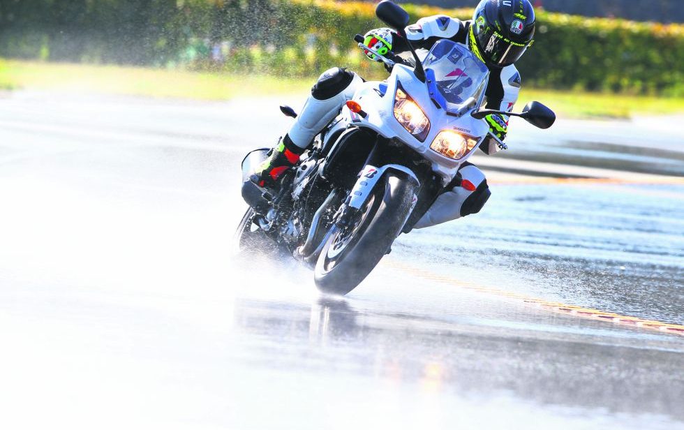 Pero antes de ir a la pista, los señores de Pirelli nos habían preparado una original sorpresa en el puerto militar de Tarento, una prueba de frenado sobre pavimento mojado, en la cubierta de un moderno portaaviones de la Armada italiana, el Portaerei Cavour. Algo que no deja de ser curioso y anecdótico, pero la verdadera prueba del producto la realizamos en la pista de Nardó. Este trazado es conocido por su famosa circunferencia de 16 metros de ancho con cuatro carriles y un desarrollo de 12,5 kilómetros. Un trazado que se emplea principalmente para establecer récords de velocidad, que permite circular a velocidades de 300 km/h mantenidos y apenas hay que inclinar la moto, va casi completamente recta.