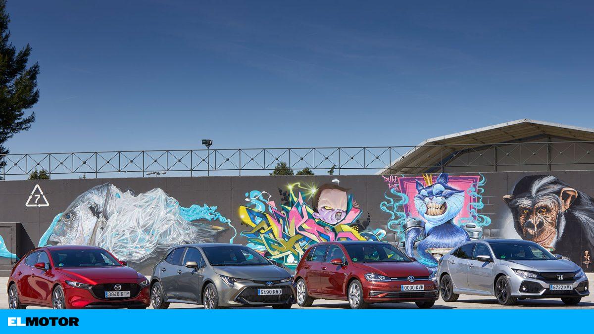 Mazda 3, Toyota Corolla, Volkswagen Golf y Honda Civic: cuatro modelos con carrocería de cinco puertas y motores de gasolina, dos híbridos con etiqueta Eco y dos convencionales.