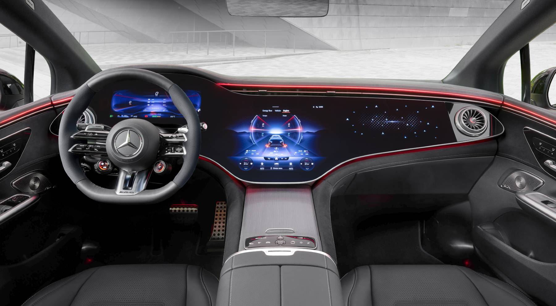 Esta pantalla, que se extiende de lado a lado del cuadro de mandos, se divide en tres sectores: instrumentación, sistema multimedia y pantalla para el acompañante. Como nota curiosa, el copiloto puede visualizar contenidos multimedia y vídeo en tiempo real en su pantalla, pero siempre y cuando el conductor esté mirando a la carretera. Una cámara interna reconoce si desvía la mirada hacia la pantalla del acompañante. En ese caso, el sistema atenúa automáticamente los contenidos.