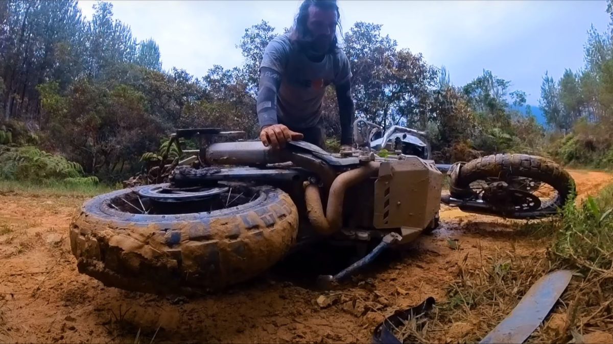 El temporal en Colombia está causando estragos en el viaje del motorista, especialmente el barro, que provoca que su moto se quede atascada.